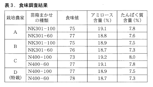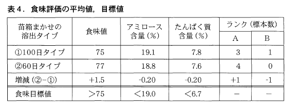 食味では,NK301の60タイプは食味値が目標以上で100タイプより1~2ポイント高まり,タンパク値も0.2ポイント下回る結果となりました(表3,表4)。