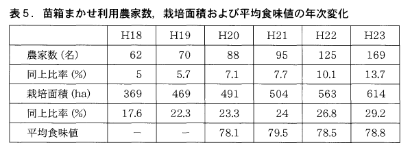 苗箱まかせの使用開始当初はJAとしては食味の観点から栽培指導には消極的でありましたが,農家同士の口コミで普及面積が増えてきたのが実状であります。