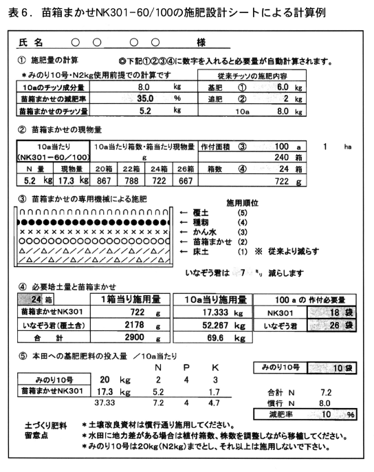 ②苗箱まかせの基本的な使い方を指導するには,苗箱まかせの施肥量計算がすぐ出来る施肥設計書が必要であることから「苗箱まかせの施肥設計シート」(表6)を作成し,施肥設計が簡単にできるようにしました。この設計シートは個人毎に作成して今年の反省と次年度の設計に生かせるように記録してあります。