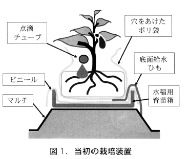 コスト的に安く,確実な給排水が可能で圃場からの病原菌の汚染を受けにくい栽培装置の開発を行いました。当初は,図1に示したような装置を用いて底面給水ひもの毛管現象により安定した排水を期待しましたが,生育後半になるとひもに藻が着生し,十分な排水が行われませんでした。