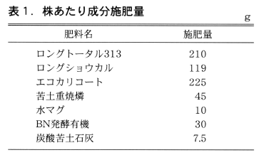 ナスに対する成分施肥量に関しては,前述の肥料以外に表1に掲げた肥料を組み合わせることにより良好な生育を確認しています。
