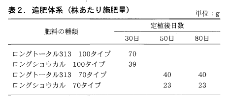 追肥のタイミングに関しては,成分供給量を収穫開始期から収穫最盛期にかけ徐々に増やして行き,収穫最盛期は出来るだけその量を維持することを目標としてその施肥設計を行い,実際の溶出量調査の結果を加味して,表2に示した肥効タイプと追肥日で実施した結果,良好な生育が得られています。