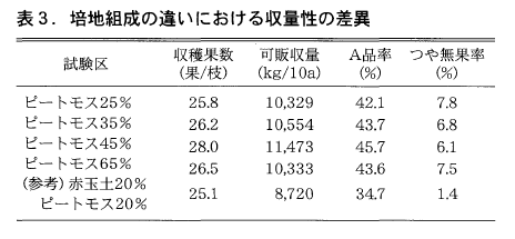 培地組成に関しては,赤玉土が入ると大きく生育が抑制され,ピートモスを主体(45~65%)としてパーライト,バーミキュライトなどを混合したものが,生育良好で(表3),軽量,コストの面からも有望でした。