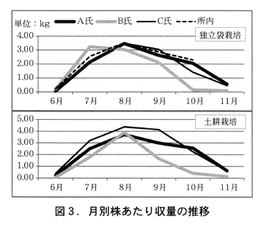 さらには,その月別出荷量を比べてみると,土耕栽培における出荷が生産者ごとにばらつきが大きいのに対して,「独立袋栽培」における生産者ごとのばらつきは小さく(図3),技術レベルや圃場の良否の影響が少ないことがうかがえます。このことは,新規栽培者のように技術レベルが低い農家や圃場の土壌条件の悪い農家でも,ある程度の収量性を確保できることを示唆しています。