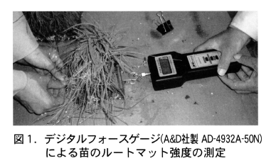 苗質調査は,播種後21日の5月10日に行った。各区2箱から採取した苗の草丈,葉齢,乾物重,窒素濃度,窒素吸収量(乾物重×窒素濃度),および苗のルートマット強度を測定した。苗強度は,箱内のほぼ中央部から10cm四方のブロックを各区2箱から2つずつ切り取り,箱の長辺方向に引いたときの最大引張力をデジタルフォースゲージを用いて測定した(図1)。