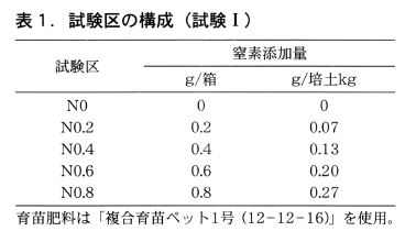 なお,窒素含有率が慣行の50%の培土は入手しづらいことから,覆土のみ無窒素の培土とする方法も考えられる。さらに,床土,覆土ともに無肥料としても問題ないと考えられるが,苗の生育量を適正に確保するため,気温との関係をさらに検討する必要がある。