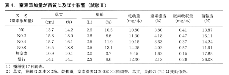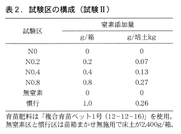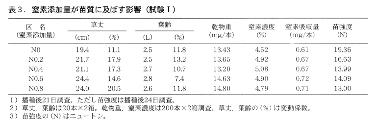また,苗のルートマット強度は,窒素添加量が多いほど弱くなる傾向にあった(表3)。