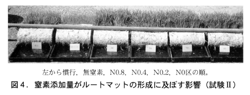 苗のルートマット強度は慣行区で最も強く,N0.8区で最も弱くなる傾向にあった(表4)が,いずれもルートマット形成は概ね良好で,移植作業に支障はなかった(図4)。