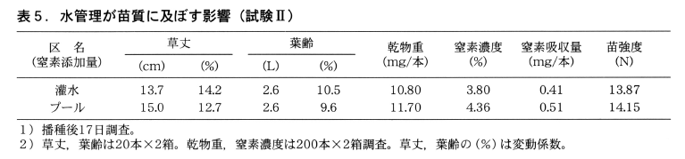 6月6日に播種した(1)のN0区と無窒素区の苗を用いて,培土の乾燥状態に応じて適宜灌水する灌水区と,ビニールシートを用いて簡易水槽(プール)を作り,湛水状態で管理するプール区を設置した。苗質調査は,試験Ⅰと同様の方法で,播種後17日の6月24日に行った。