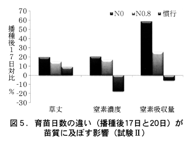 6月6日に播種した(1)のN0区,N0.8区および慣行区の苗を用いて,播種後20日まで育苗日数を延長した後,苗質調査を実施した。