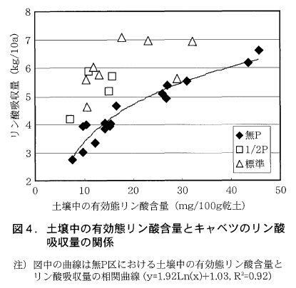 土壌の有効態リン酸含量とキャベツのリン酸吸収量との関係においても,リン酸吸収量は土壌中の有効態リン酸含量が増加するとともに増加する傾向が見られた(図4)。また,1/2P区および標準区のリン酸吸収量は,同程度の有効態リン酸含量であっても,無P区と比較して多くなる傾向が見られた。これは,キャベツが施肥したリン酸を吸収したことによるものと考えられた。一方で,無P区では,土壌中の有効態リン酸含量とキャベツのリン酸吸収量の相関決定係数が0.92と高く,両者に密接な関係が認められ,このグラフに対する回帰式から,土壌中の有効態リン酸含量が25mg/100g乾土以上であれば, リン酸質肥料を施用しない場合であっても,5kg/10a以上のリン酸がキャベツに吸収され, 目標収量である5トン/10aが達成できると考えられた。