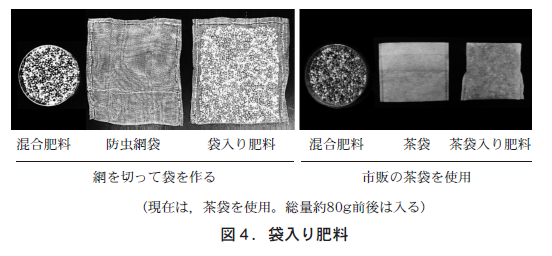 9月23日(第1段花房開花時) ,栽培容器(縦19cm×横33.5cm×高さ15.5cm)をプラスチック板で半分に仕切り1区画3Lに1株を定植する。砂は川砂を2mmの篩いにかけ数回水洗し粘土質を除去して使用する(現在では,市販の川砂を使用) 。対照としての土は畑土:バーク堆肥:ピートモス:パーライト=2:4:1:1(v/v)の混合土とし(この土培地は,毛管力の点からも最も良いことが分かっている3)) ,肥料は全量を防虫網袋(現在では茶袋)に詰め(図4) ,栽培容器内の「ひも」上に置く(なお,図3では追肥も示してあるが,必要と判断されたときは置肥として施肥すればよい) 。