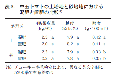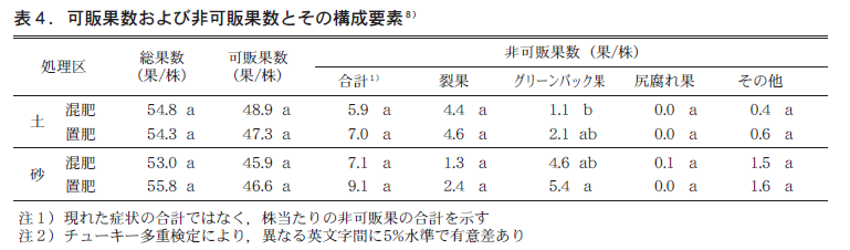 この試験で尻腐れ果の発生がほとんど認められないのも,9月から翌年の2月の栽培時期が関係しており,低い気温と地温,さらには低日射14)が影響しているものと考えられる。果実の糖度は約8%で全処理区間に有意差はなく,酸度は砂区の方が土区より低い。非可販果のグリーンバック果は高段位で発生し,砂区で多い傾向にあるが、この障害果はカリ欠乏で発生することが報告されており14),砂区のグリーンバック果を減少させるには,果実酸度の向上も念頭にカリウムの施肥量を増やす必要があると考えられる。