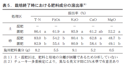 肥料の分析試料は80℃で2,3日乾燥させ,全窒素はCNコーダーで,P2O5はバナドモリブデン酸比色法,K2O,CaOおよびMgOは1M塩酸で抽出後,原子吸光法で測定している。表5は平均地温が約18℃,4か月半の終了時における被覆肥料の溶出率が示されている。土の混肥区(これは回収できない)を除いて,全区とも成分溶出率は全窒素およびカリウムで80%以上と非常に高い。使用した肥効調節型肥料の養分は水分と温度に依存して溶出する特性がある。培地の液相率は土区が51.3%,砂区は16.3%とあるが,表5で見る限り肥料溶出率は土と砂の間に差がない。砂は液相率が16%であっても毛管水の移動速度が速く常に湿度を保っているため溶出率が高くなるものと推察される。
