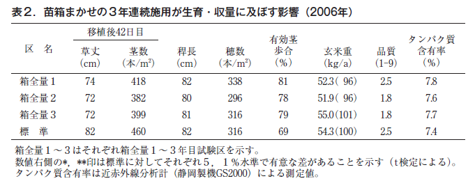 2006年は減肥率が45%と当初設計の40%を上回る値となったために移植後の生育量が不足気味になり,箱全量1,2区の玄米重は標準区対比で96%とやや少なくなった。減肥率が38%であった2004年の箱全量各区は標準区に対して101%以上となり,遜色ない玄米重であった。過去の筆者の試験事例からも概ね40%の減肥率が確保できれば,収量は標準並みを確保できることが明らかになっている(高橋ら 2007)。この傾向は2006年の箱全量3区(3年間の連年施用試験区)でも標準区に対する収量や品質の明らかな低下は認められなかった。