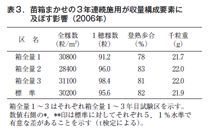 2003年は標準区と箱全量区の2区,2004年は標準区と箱全量1年目区と同2年目というように箱全量区を順次増やし,3年目の2005年は標準区と箱全量区の1,2,3年目の3区を設定した(以下,箱全量1区,同2区,同3区)。しかし,2005年はイナズマヨコバイが9月後半に例年にない異常発生をしたため,この影響を受けて収量が試験区によって大きく異なる結果となった。このため2006年は2005年と同様の圃場設計として,連年3年目として再検討を行った。