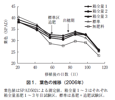 2006年の葉色推移を図1に示した。箱全量各区の減肥率は45%と目標設定を上回ったため,本田生育期前半の葉色値は標準区の葉色値よりもやや低いが,概ね標準区と同様の推移を示した。