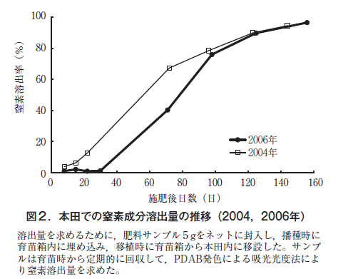 2004,2006年の苗箱まかせの肥料溶出量を図2に示した。調査期日が一部異なり,両年の溶出パターンにも多少の差があるが,いずれの年次も収穫時期までに95%程度の成分が溶出した。