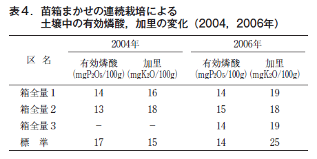 また,栽培終了後の土壌調査では2004年の有効燐酸,2006年の加里は標準区の値を下回っているが有意な差ではなく,いずれも群馬県の水田の施肥基準を上回っており,不足は特に認められなかった(表4)。