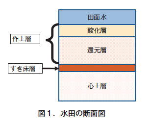 湛水している水田の断面図を示します(図1)。初めに田面水があり大気(空気)と遮断されています。次に耕起されて肥料が施用され,イネが生育し根を張る作土層,作土層の下に硬い盤層であるすき床層,その下に耕起されていない心土層から成り立っています。作土層も二層に分かれていて,地表面の酸化的な酸化層(土色は褐色)と,その下の還元的な還元層(土色は青灰色)に分かれています。土色の違いは鉄の形態の違いによります。すき床層は土がしっかり固めてあり,土壌のち密度(土壌硬度)が高いので水を通しにくくなっています。