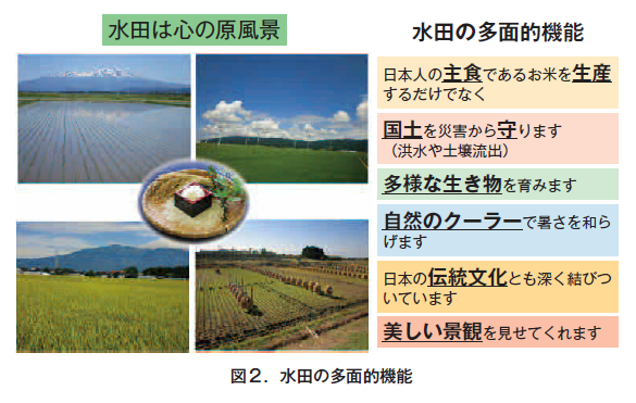 水田は日本全国にあり,水田のある景色は子供のころから見慣れた風景で,日本人の原点ともいえます。日本人の主食であるお米が水田で作られていることは皆知っていると思いますが,水田はイネを育てるほかにも様々な役割があります(図2)。