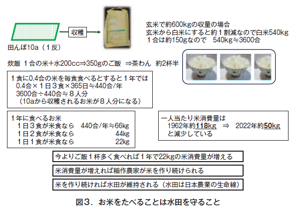 2020年の基幹的農業従事者数は136万人で日本の人口の約1%であり,言い換えれば99%の国民は農家に農作物を作ってもらう立場といえます。しかも高齢化が進み,離農したり水田を手放す農家が増えています。毎日の食事で何を食べるのかということは,何を作ってもらうのかということです。お米は国内で自給可能な穀物であり,生産・流通・消費のサイクルが国内で回る食料です。今よりもご飯1膳多く食べれば年間約22kgのお米消費となり,稲作農家がお米を作り続ける原動力となります(図3)。一人一人の消費行動が社会を変えることができるということを国民全体で認識し,日本の稲作を守っていきたいものです。