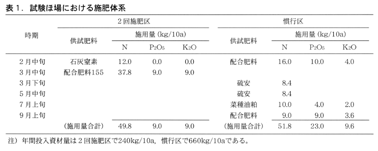 試験ほ場における2回施肥区と慣行区への施肥の概要を表1に示した。