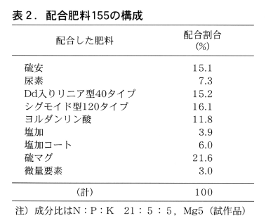 さらに配合肥料155を利用した2回施肥区は,環境負荷低減に加えて,近年過剰傾向にあるP2O5,K2O成分を削減した施肥体系となっており,肥料コストならびに施肥労力の削減が可能な低コスト省力技術であると考えられる。