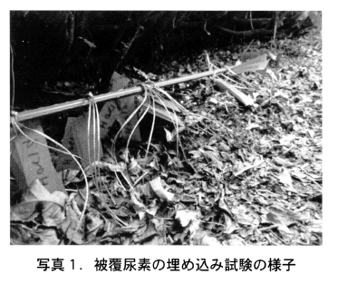 埋め込みサンプルはポリエチレン製メッシュ(目開き1mm程度)の袋に各肥効調節型被覆尿素を等量入れたものを用い,試験ほ場に表層から5cmおよび20cmの深さに埋設した(写真1)。