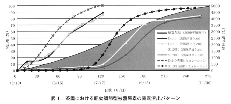 石灰窒素ならびに肥効調節型被覆尿素Dd入りリニア型40タイプとシグモイド型120タイプを組み合わせた配合肥料155を施用することにより,茶の生育期間全体で連続的な窒素の溶出が確認された。