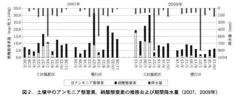 春から秋にかけて土壌中の無機態窒素の推移を調査した結果,2回施肥区では慣行施肥と比較して4~8月のうね間土壌中のアンモニア態窒素濃度が高く維持された(図2)。また,降水量が多い時期でも慣行区に比べ土壌中無機態窒素量がやや多く維持された。