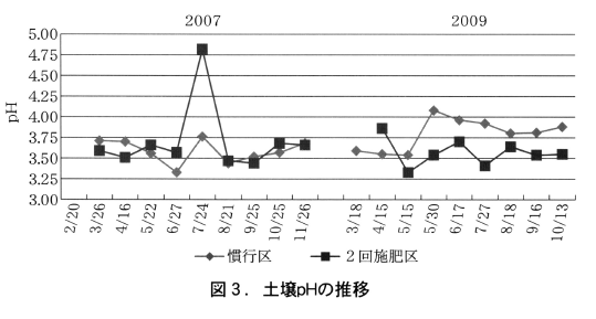 2007年の調査では,7月に2回施肥区のみpH4.8と高い値を示したが,その他は両試験区ともpH3.3~3.8で同様の推移を示した(図3)。