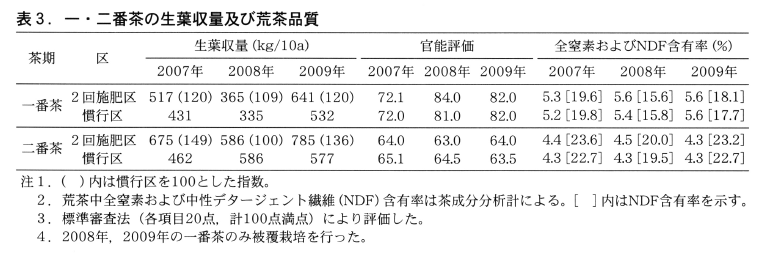 2回施肥区と慣行区における生葉収量および荒茶品質を表3に示した。