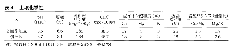 試験を開始して3年経過後の2回施肥区と慣行区のうね間土壌の化学性を表4に示した。