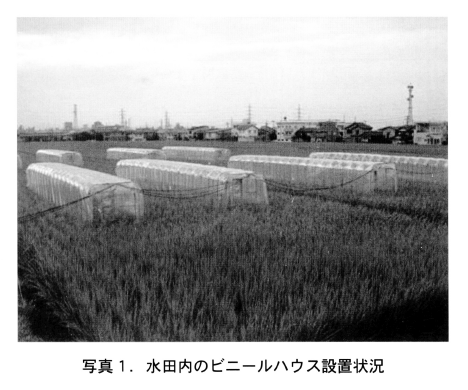 通常の気象条件の年でも暑い夏を再現するために水田内に長さ8m,幅1.5m,高さ1.8mのビニールハウスを設置し,出穂5日後から2週間程度高温処理を実施した(写真1)。処理期間のビニールハウス内中央部分の気温は,日平均で1.2℃外気温より高まっていた。日射がある昼間の気温は平均で2.3℃外気温より高まっていたが,夜間の気温は0.3℃の上昇とビニールハウス内外の気温差はほとんどなかった。