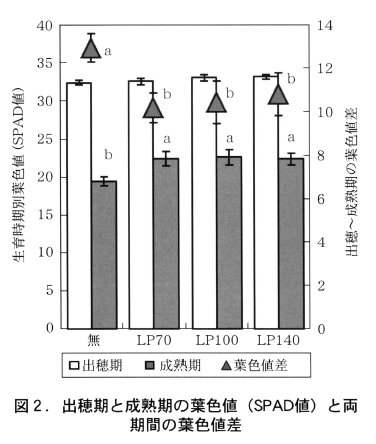 (2)リニア型被覆尿素を基肥の速効性肥料と配合して本田に施用すると,出穂期以降も持続的に窒素が供給されるため,登熟期間の葉色値の低下を抑制できる。