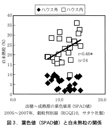 登熟初期が平年より高温であった2005~2007年の試験結果を中心に被覆尿素肥料の肥効が外観品質に与える影響を検討した。出穂期から成熟期の葉色値の差と白未熟粒の関係を図3に示す。ハウス外では出穂期から成熟期の葉色値の差と白未熟粒の発生に関係が認められなかったが,ハウス内では出穂期から成熟期にかけての葉色値の低下が大きいほど白未熟粒が増加する傾向にあった。成熟期にかけて葉色値が低下するような稲体の窒素栄養状態の場合,高温登熟条件では平年の気象条件下より白未熟粒の発生が多くなった。