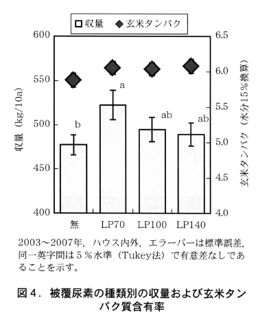 被覆尿素の種類別の収量および玄米タンパク質含有率を図4示す。収量は被覆尿素の施用で高まる傾向がみられLP70では有意に高まった。玄米タンパク質含有率は被覆尿素の施用で高まる傾向がみられたが,その差は小さく,食味を低下させるほどではないと思われた。