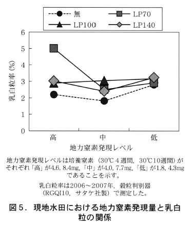 その効果は水田土壌からの窒素発現パターンとほぼ同様なLP140が安定して高かったが,地力窒素発現量が多い水田では,LP70 の施用により,籾数が増加して乳白粒が多発する傾向が認められた(図5)。地力窒素発現量を考慮し,被覆尿素の上乗せだけでなく,基肥に使用する速効性肥料を減肥するなどして生育量をコントロールする必要があると考えられた。