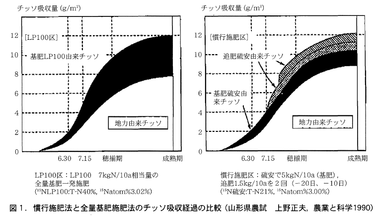 これまで,ややもすると,水稲の収量は,土壌の素質(主に窒素肥沃度)によって支配される傾向がありました。しかし,被覆肥料の出現は,地力の低い土壌(養分保持力が小さく,生育後期の窒素供給も低く秋落ちする土壌)でも,地力の高い土壌に変身できる期待を抱かせるものでした。つまり,土壌の持つ地力と施肥が一体化して,目標とする土壌の窒素肥沃条件を作り得る可能性をもたらしたことになります。図1が慣行施肥区(基肥5,追肥1.5,1.5kgの計8kg)に匹敵したLP区(LP100が7kgのみ)の窒素吸収経過です。