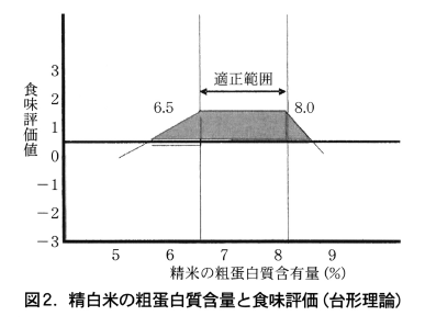そこで,食味と米の粗蛋白含量の関係が単純な負の直線関係で説明されるものではなく,品質(整粒歩合)や収量性を総合的に検討した結果,図2に示したように,食味値と精米粗蛋白含量の適正水準(台形理論)を提案しました。ここでは,適正範囲を6.5%~8.0%としていますが,各地域で,品種別に変曲点の数値を検討し,コンセンサスを得た数値として見直すことは何らさしっかえないし,そうすべきと考えています。