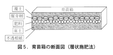 (2)標準的な施肥方法としては,育苗箱に床土を入れた後に専用肥料を施肥,播種,覆土を行う「層状施肥法」によって播種と同時に施肥作業を行います。育苗期間における専用肥料の溶出は極少に抑えられます(これがこの肥料の生命線です)。また,育苗1箱あたり速効性肥料(N成分で0.5~1g)は,従来どおり床土に施肥する必要があります。