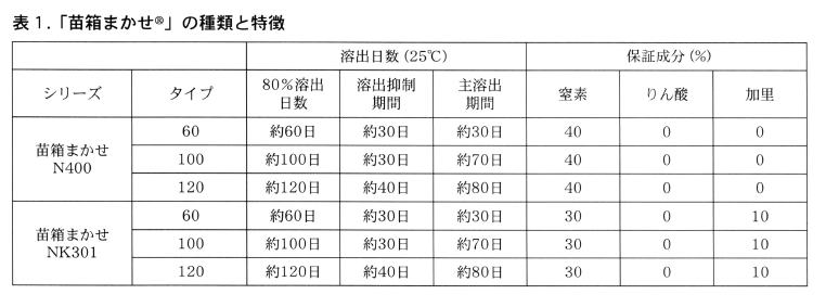 現在,この施肥法に使える資材は,表1に示したジェイカムアグリ(株)の「苗箱まかせ