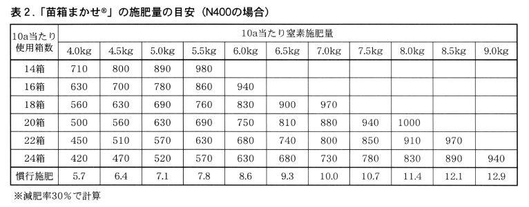 400-60,100,120」,および「苗箱まかせNK301-60,100,120」に限られ,その他の被覆肥料は使うことができません。ラグ期間はそれぞれ,30日(60,100タイプ)に設定しています。