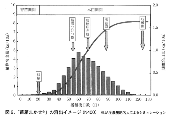 一定期間,溶出が抑えられるシグモイドタイプの被覆尿素「苗箱まかせ®」を用いて,生育期間に必要な窒素の全量を育苗箱内に施用し,育苗終了後,移植苗とともに本田に持ち込む全量基肥施肥法です。肥料が稲の根と接触しているため,窒素の利用率が高まり,従来の全量基肥施肥法よりさらに施肥効率が向上します。