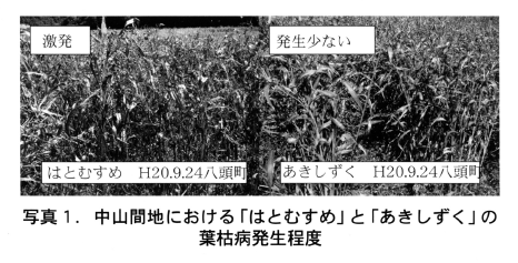 (3)晩播においては「あきしずくJを用い,やむを得ず連作を行う場合は葉枯病に極めて強い「とりいずみ」を作付する等の利用が可能である。