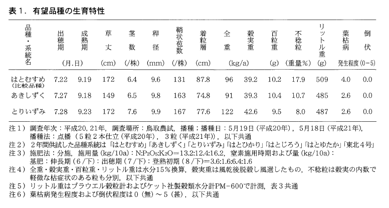 §鳥取県におけるハトムギ有望品種「あきしずく」および「とりいずみ」の選定と肥培管理法