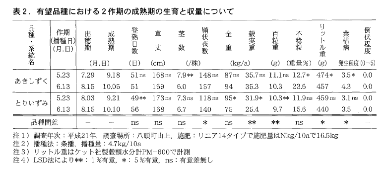 以上により,鳥取県に適した品種として,着粒層はいずれも狭く早熟,短稈で葉枯病に強い「あきしずく」,晩熟,やや長稈,多収で葉枯病に強い「とりいずみ」を選定した。