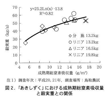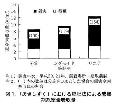 以上より,窒素施肥法は,リニア140タイプを全量基肥施用することにより,成熟期の窒素吸収量および穀実吸収割合が高く,分施と比べて穀実重が向上した。