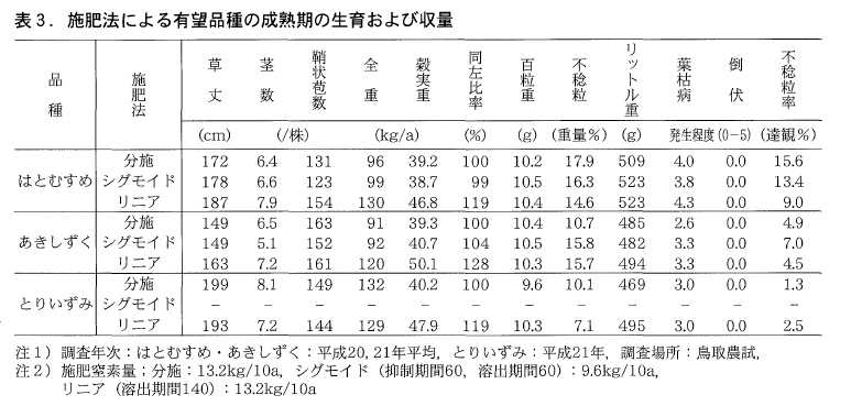 リニア140タイプおよびシグモイド120タイプの窒素吸収特性については「あきしずく」および「はとむすめ」を供試し,リニア140タイプの施肥量の検討については「あきしずく」「とりいずみ」を供試した。